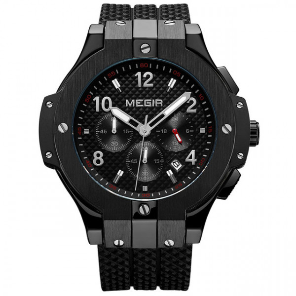 Montre homme MEGIR 2050 Montres décontractées en silicone noir avec cadran gravé en 3D pour hommes