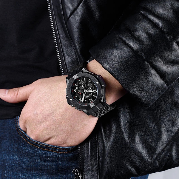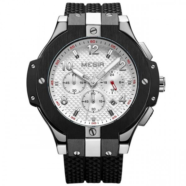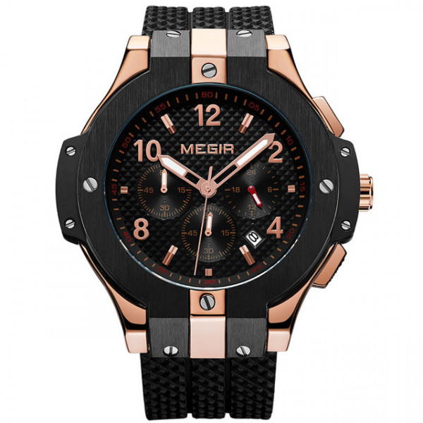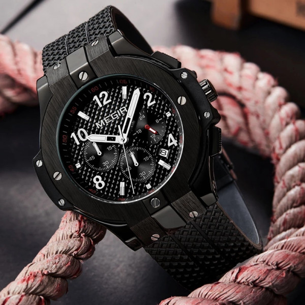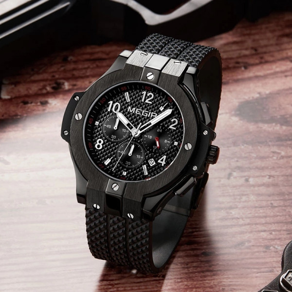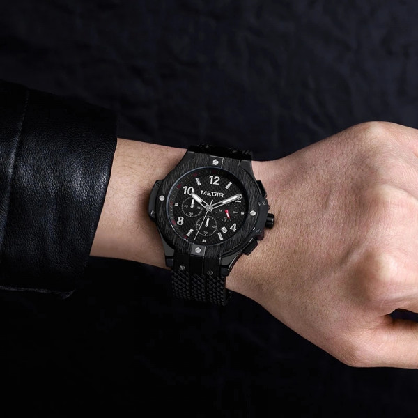 Montre homme MEGIR 2050 Montres décontractées en silicone noir avec cadran gravé en 3D pour hommes