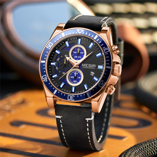 MEGIR 2132G MONTRE DE LUXE À QUARTZ AVEC CADRAN EN OR ROSE ET BRACELET EN CUIR ÉTANCHE POUR HOMME